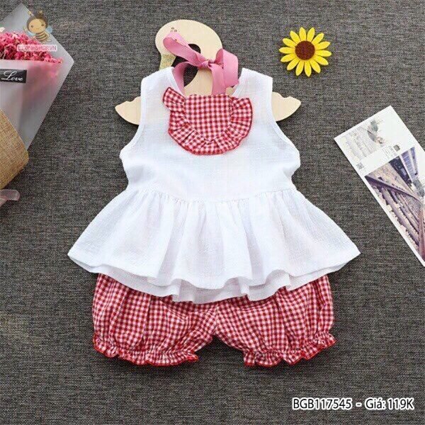 Set áo nhún bèo xoè may túi trước quần bí caro cực iu cho bé ngày hè. Áo chất vải linen mềm mát, thoáng thích hợp ngày hè, eo nhún bèo kèm túi kiểu cực iu, phía sau cột dây cổ. quần bí caro chất kate mềm mại, bo thun.